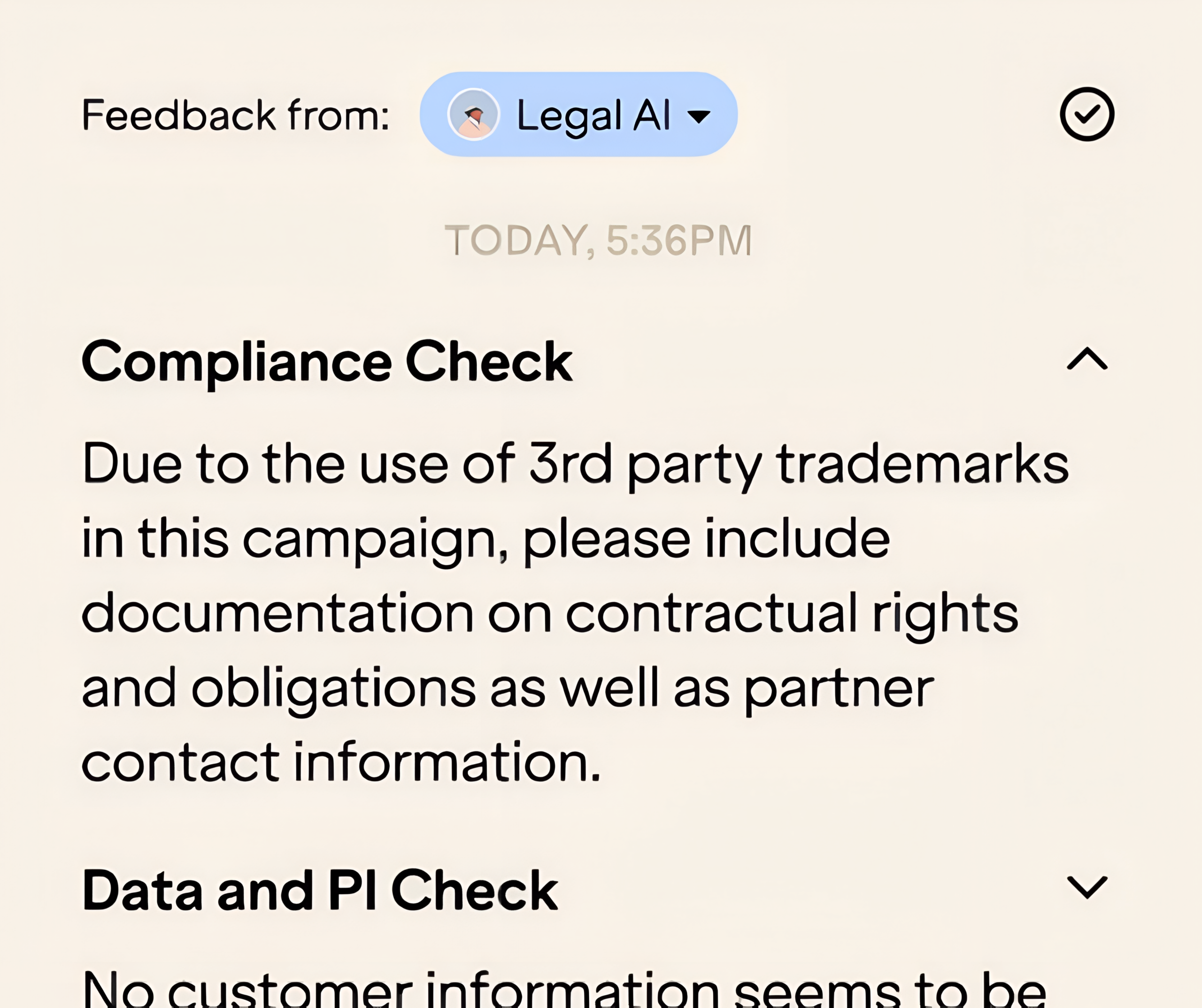 Automate alignment by training AI on brand guidelines, legal standards, and regulatory requirements.